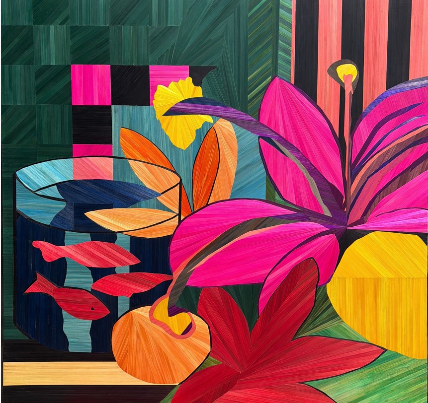 Artiste, Sarah Pouget Gillyboeuf développe une pratique contemporaine de la marqueterie de paille. Formée en France au sein de l’Atelier Lison de Caunes, référence internationale de la marqueterie de paille, elle acquiert une maîtrise technique d’exception qu’elle met aujourd’hui au service d’une œuvre personnelle et engagée. Installée à l’Île Maurice, son travail se nourrit des croisements culturels, de la lumière insulaire et d’une réflexion sur les notions de dialogue, de féminité et de transmission. Ses œuvres, pièces uniques, interrogent la frontière entre artisanat d’art et art contemporain.