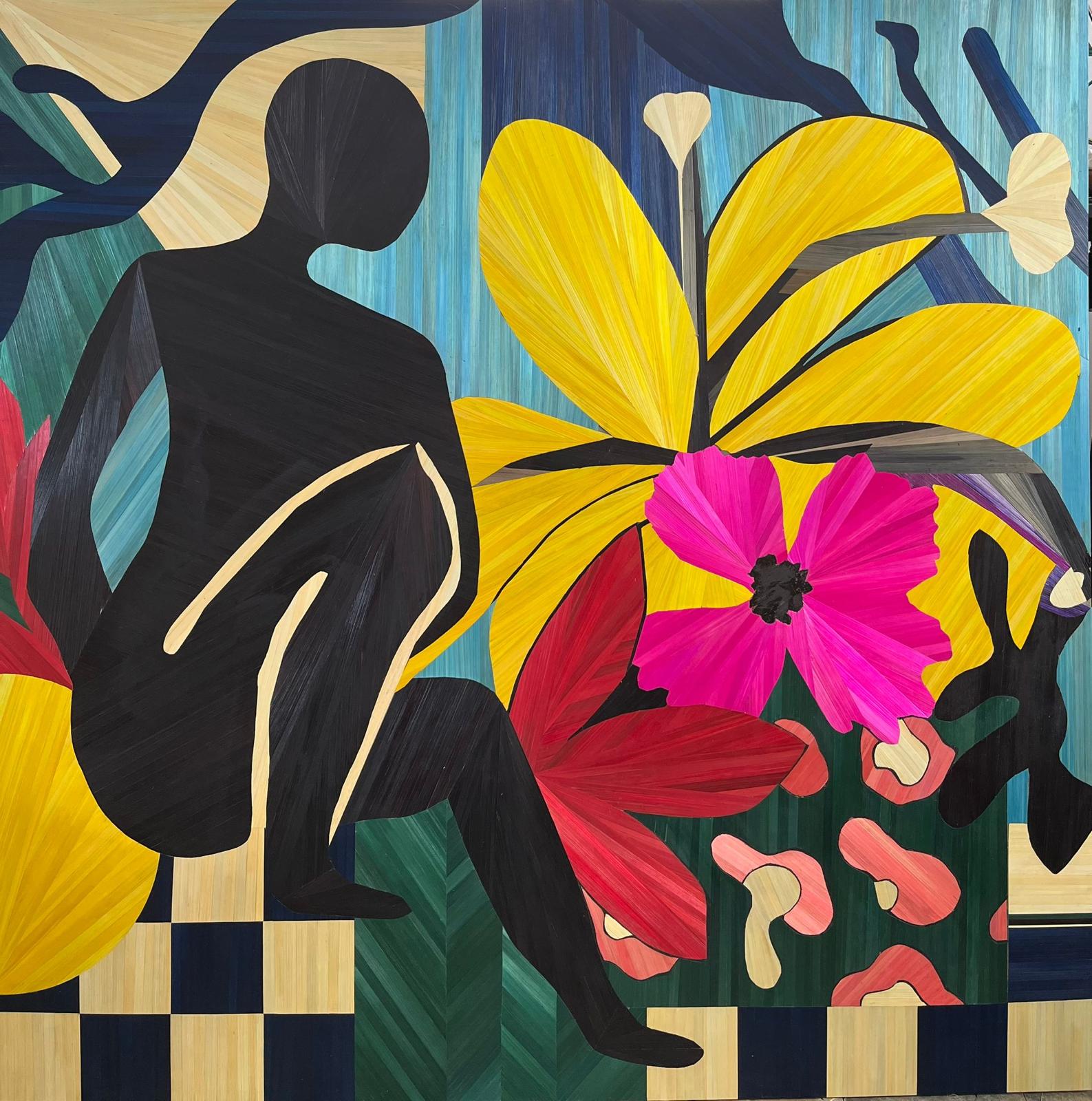 Artist Sarah Pouget Gillyboeuf develops a contemporary practice of straw marquetry. Trained in France at the Atelier Lison de Caunes—an international reference in the field—she acquired exceptional technical mastery, which she now places at the service of a personal and engaged body of work. Based in Mauritius, her practice is nourished by cultural intersections, island light, and a reflection on themes of dialogue, femininity, and transmission. Her works, all unique pieces, question the boundary between fine craftsmanship and contemporary art.