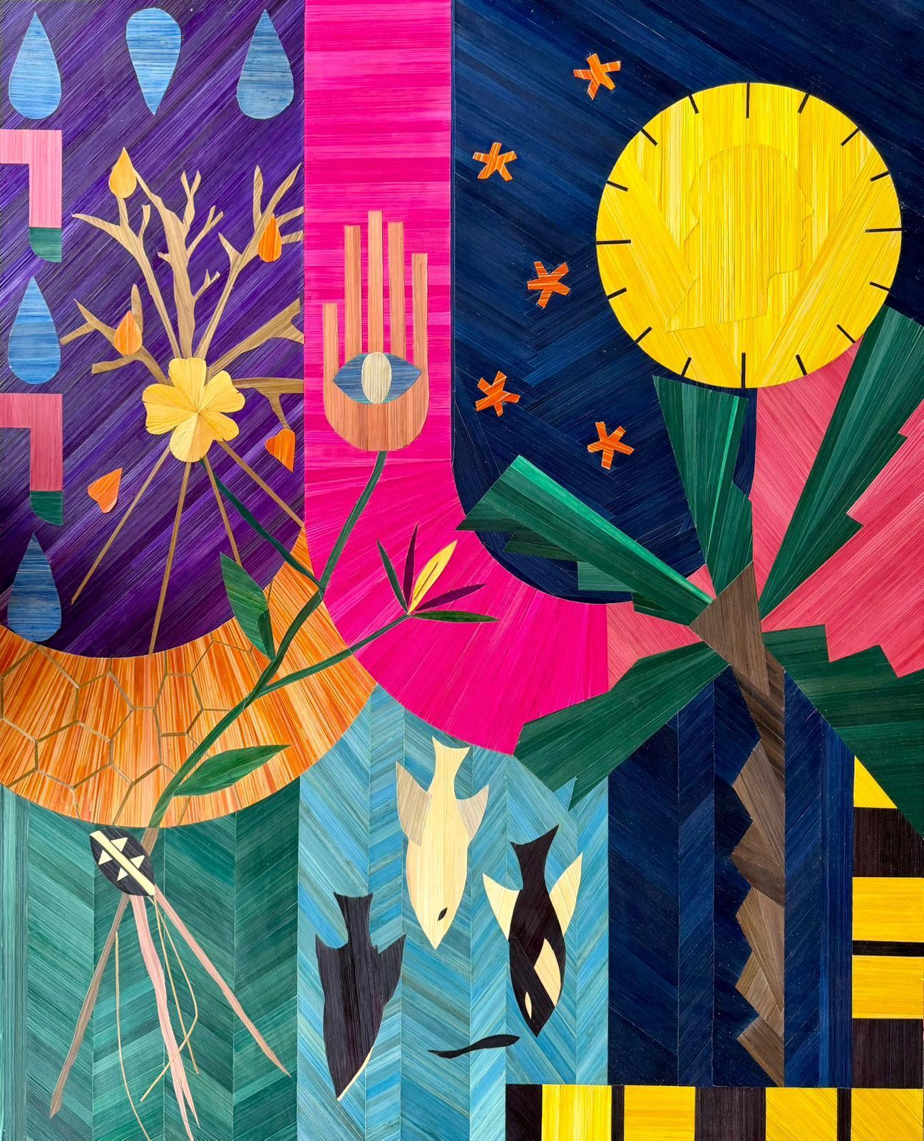 “My work in straw marquetry explores the meeting of plant-based material, vibrant color, and controlled gesture. I work without templates or tracing, using only ruler cuts and freehand technique, in total mastery of the gesture, where each choice is precise, intentional, and definitive.