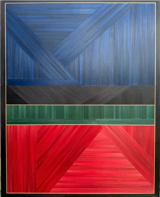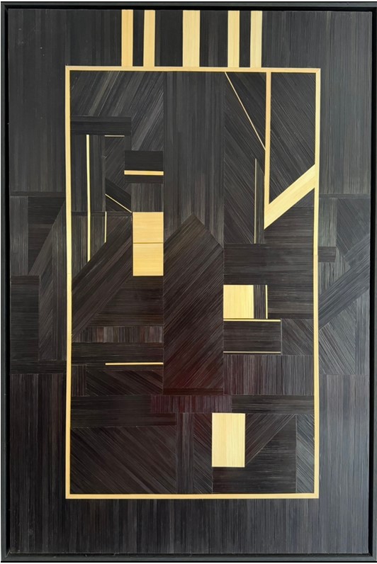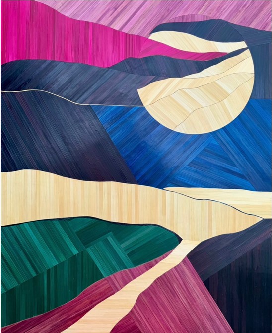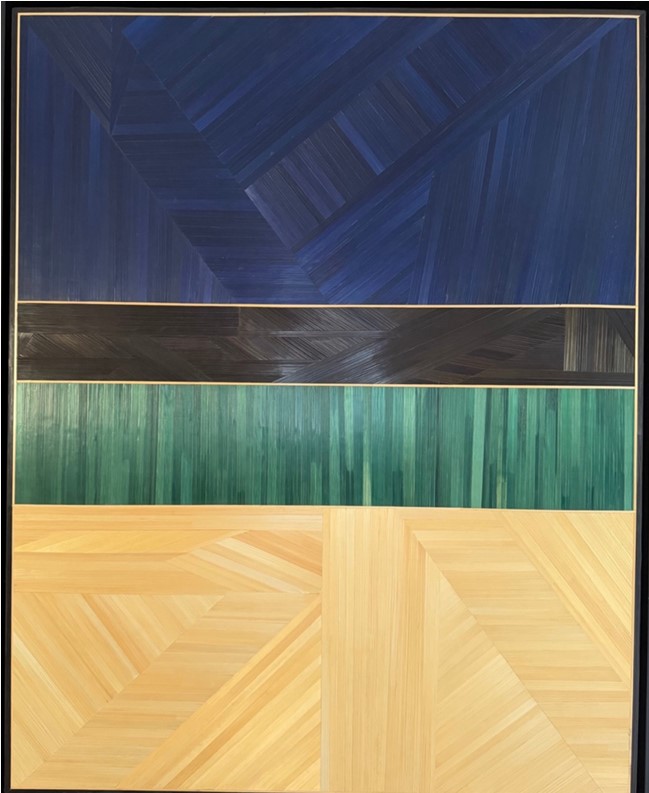 “Mon travail en marqueterie de paille explore la rencontre entre matière végétale, couleur vive et geste maîtrisé. Je travaille sans gabarit ni calque, uniquement par coupes à la règle et à main levée, dans une maîtrise totale du geste, où chaque choix est précis, engagé et définitif.
